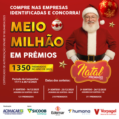 A campanha Natal Premiado Acimacar é promovida pela Acimacar, com patrocínio de Sicoob Confiança, Edemar Imóveis, Humana Saúde e Vorpagel Materiais de Construção, e é legalizada pela Secretaria de Acompanhamento Fiscal, Energia e Loteria (Sefel), do Ministério da Economia e Fazenda.